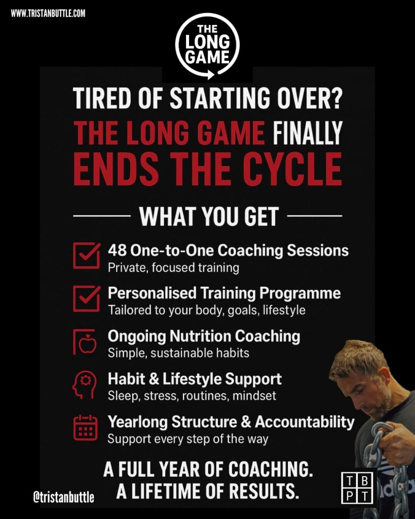 The Long Game is a 12-month, one-to-one coaching programme for busy adults who are tired of quick fixes, constant restarts, and never feeling in control of their health.